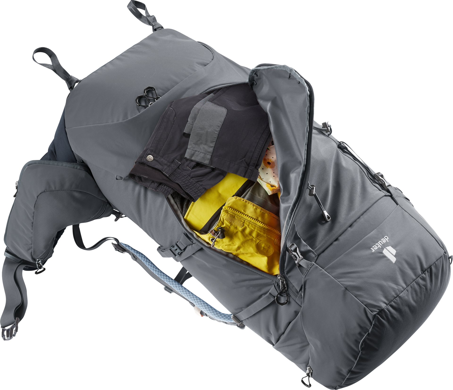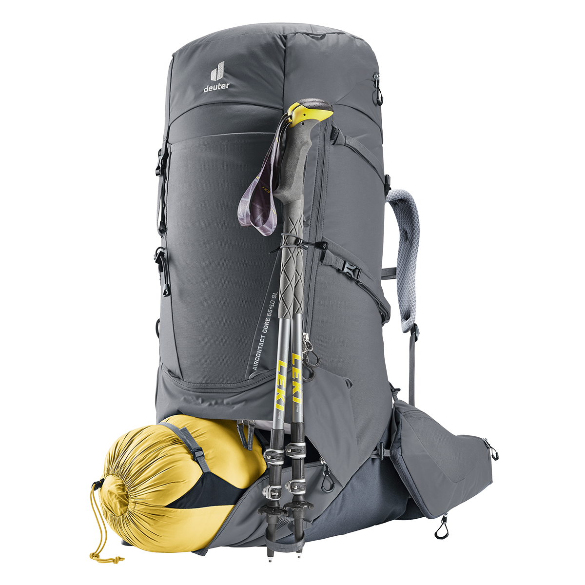 Deuter Aircontact Core, çantanın üstün taşıma konforu ve yük dağılımı, Air Spacer fileli deuter Aircontact sırt sistemine ve geniş bir havalandırma kanalına, ayrıca rahat omuz askılarına, hareketli kalça yüzgeçlerine ve ergonomik bir bel yastığına dayanır. Ön taraftaki tam uzunlukta, J şeklinde fermuar, ana bölmede daha aşağıda bulunan eşyaları hızlı ve kolay bir şekilde bulmanızı sağlar. Çıkarılabilir 3 litrelik kalça yüzgeç cepleri ekstra depolama alanı sağlar ve eşyaları erişilebilir bir yerde tutar. Fermuarlı 1,5 litrelik şişe kılıfı da hareket halindeyken su içmenizi sağlar.