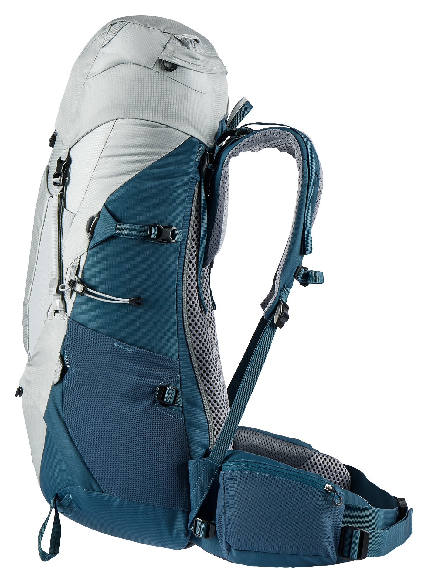Y-şekilli çerçeve, kalçaları saran hareketli kalça kanatçıkları ve Deuter'in ergonomik yamuk şeklindeki bel yastığı, yükü etkili bir şekilde dağıtmak ve dengelemek için birleşir.