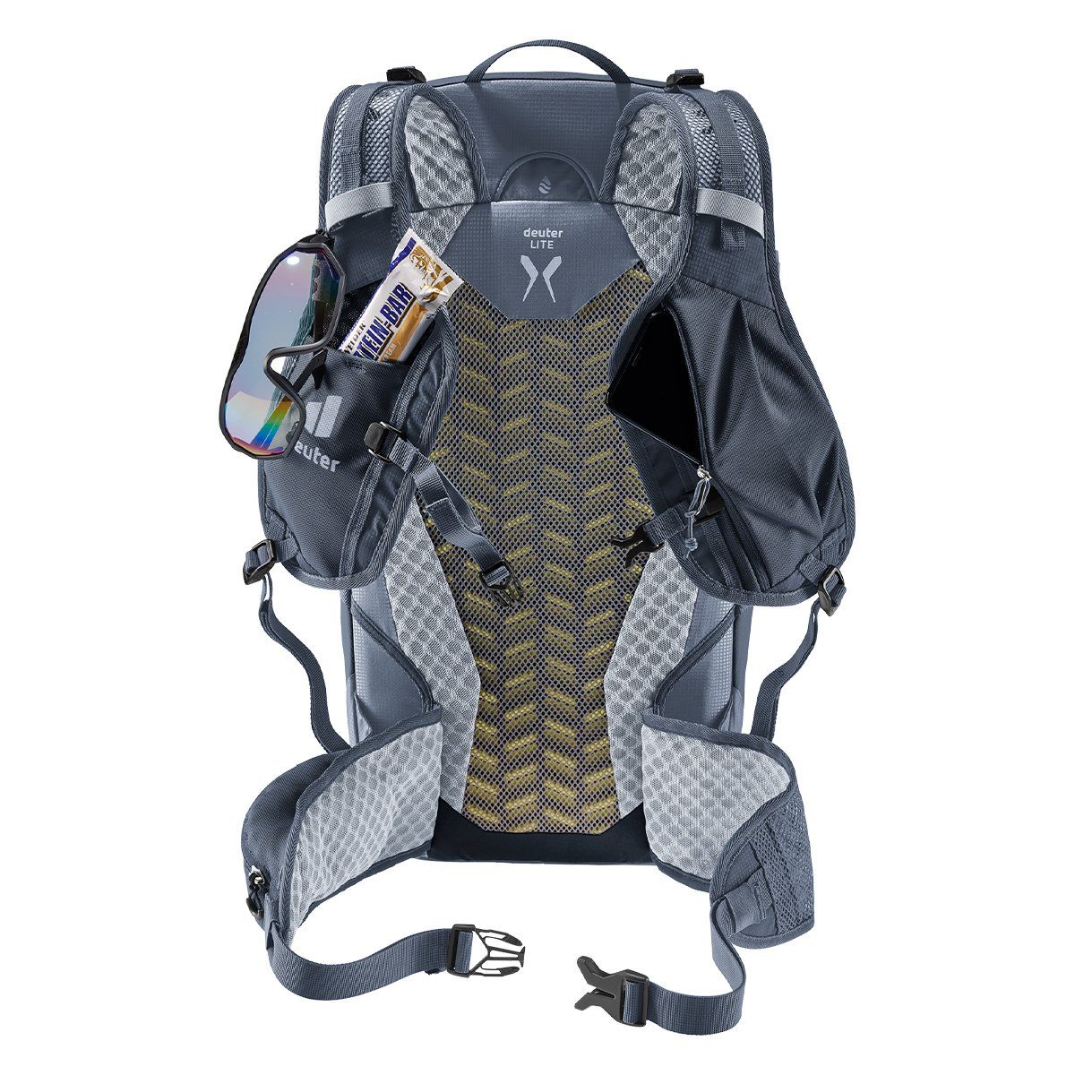Deuter'in Lite sırt sistemi, yelek tarzı, delikli omuz askıları, esnek kalça yüzgeçleri, hassas ayarlanabilir göğüs kemeri ve %100 geri dönüştürülmüş, bluesign® sertifikalı gövde kumaşı sayesinde hızlı, hafif ve sürdürülebilir. Hızlı tempolu yürüyüş ve patika koşusu için tasarlanan yan sıkıştırma askıları yükün sallanmasını etkili bir şekilde azaltır ve tam hareket aralığı sağlar. Omuz askılarındaki bir cep ise patikada ihtiyacınız olan her şeyi elinizin altında tutar.