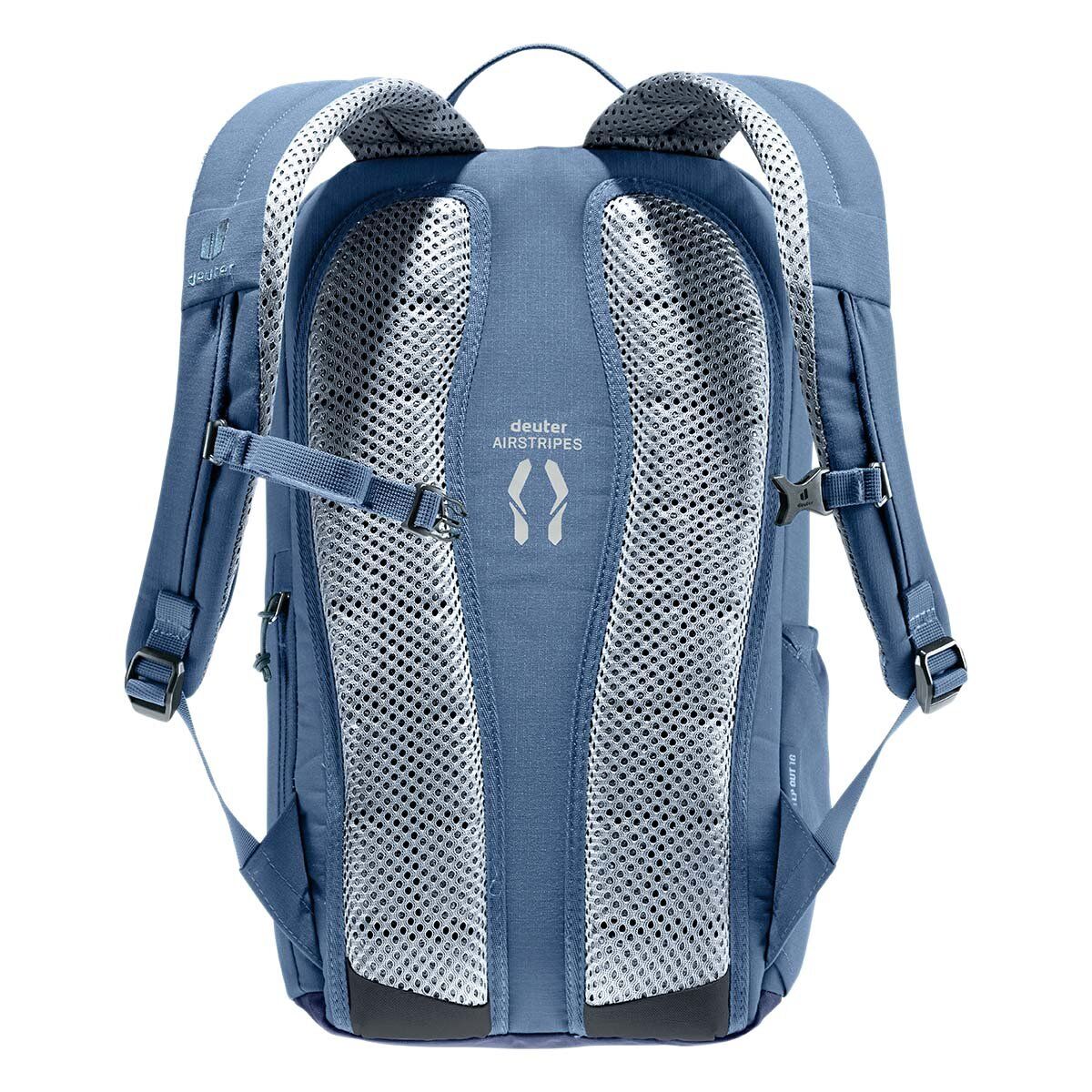 Deuter StepOut, ergonomik olarak oluşturulmuş omuz askılarına ve Deuter Airstripes arka sisteminin azaltılmış temas yüzeyine sahip olan Stepout'un göze çarpan nitelikleri havalandırma ve konfor taşır. Bir rulo üstü açıklık (ekstra alanla), arka tarafa karşı cep telefonu cebi ve gerilmiş yan cepler, önemli öğelere hızlı erişim sağlar. İçinde daha organize paketleme için bir belge kesesi, dizüstü bilgisayar kılıfı ve su şişesi kılıfı bulunmaktadır. Bu Yeşil Düğme sertifikalı bluesign® ürününün PFC içermeyen kumaşı,% 100 geri dönüştürülmüş PET şişelerden (26 x 0.5 litrelik şişeler) ve bluesign® standartlarına göre üretilmektedir.