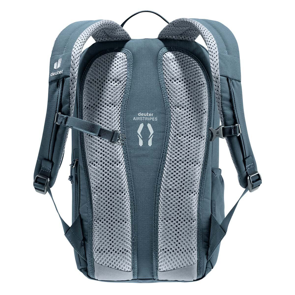 Deuter StepOut, ergonomik olarak oluşturulmuş omuz askılarına ve Deuter Airstripes arka sisteminin azaltılmış temas yüzeyine sahip olan Stepout'un göze çarpan nitelikleri havalandırma ve konfor taşır. Bir rulo üstü açıklık (ekstra alanla), arka tarafa karşı cep telefonu cebi ve gerilmiş yan cepler, önemli öğelere hızlı erişim sağlar. İçinde daha organize paketleme için bir belge kesesi, dizüstü bilgisayar kılıfı ve su şişesi kılıfı bulunmaktadır. Bu Yeşil Düğme sertifikalı bluesign® ürününün PFC içermeyen kumaşı,% 100 geri dönüştürülmüş PET şişelerden (26 x 0.5 litrelik şişeler) ve bluesign® standartlarına göre üretilmektedir.