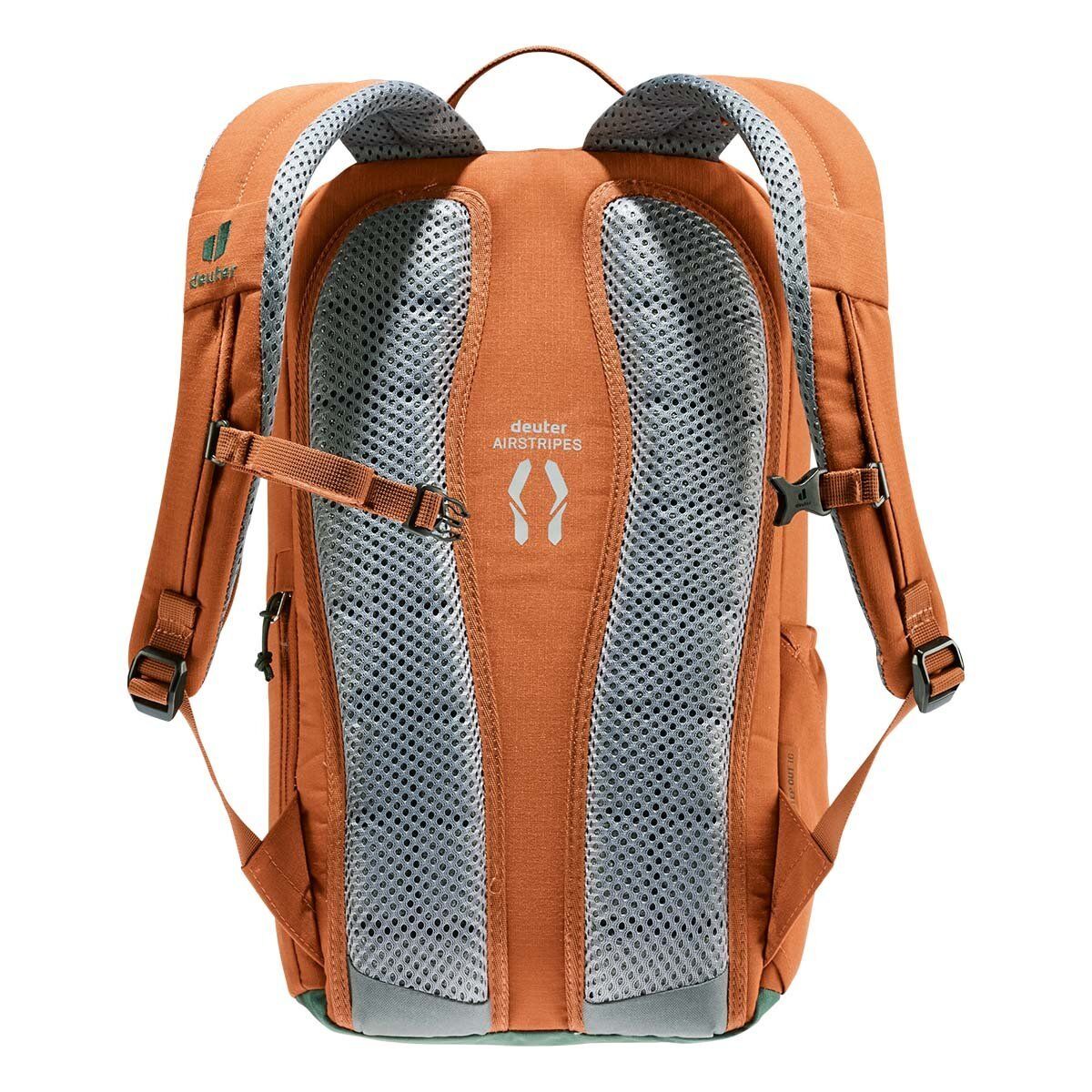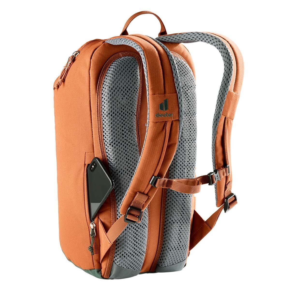 Deuter StepOut, ergonomik olarak oluşturulmuş omuz askılarına ve Deuter Airstripes arka sisteminin azaltılmış temas yüzeyine sahip olan Stepout'un göze çarpan nitelikleri havalandırma ve konfor taşır. Bir rulo üstü açıklık (ekstra alanla), arka tarafa karşı cep telefonu cebi ve gerilmiş yan cepler, önemli öğelere hızlı erişim sağlar. İçinde daha organize paketleme için bir belge kesesi, dizüstü bilgisayar kılıfı ve su şişesi kılıfı bulunmaktadır. Bu Yeşil Düğme sertifikalı bluesign® ürününün PFC içermeyen kumaşı,% 100 geri dönüştürülmüş PET şişelerden (26 x 0.5 litrelik şişeler) ve bluesign® standartlarına göre üretilmektedir.