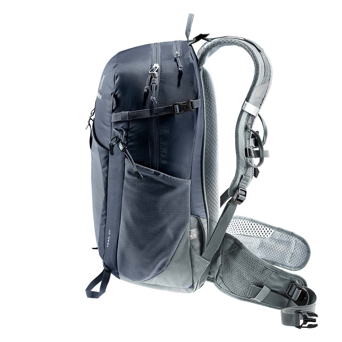 Deuter Trail 25, Deuter Airstripes arka sisteminin azaltılmış temas yüzeyi ve büyük havalandırma kanalları, delikli omuz askıları ve kalça yüzgeçleri ile birleştirilmiş, herhangi bir araziye sığmakta olan bir rahatlık için maksimum hava akışı ve hatta ağırlık dağılımı sağlar. Omuz askılarındaki döngüler, ferrata seti karabinaları elinizin altında tutar. Açıklık etrafında geniş bir fermuar, ön ve yan ceplerde elastik saklama cebi sayesinde, ekipmanlarınıza erişmek her zaman kolaydır.