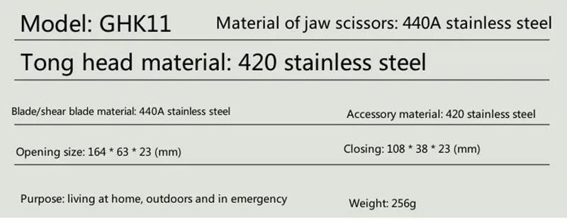 * Altıgen anahtar, iğne kargaburun, tel kesiciler, tel kesiciler, tıbbi acil pense ve diğer fonksiyonlar dahil.