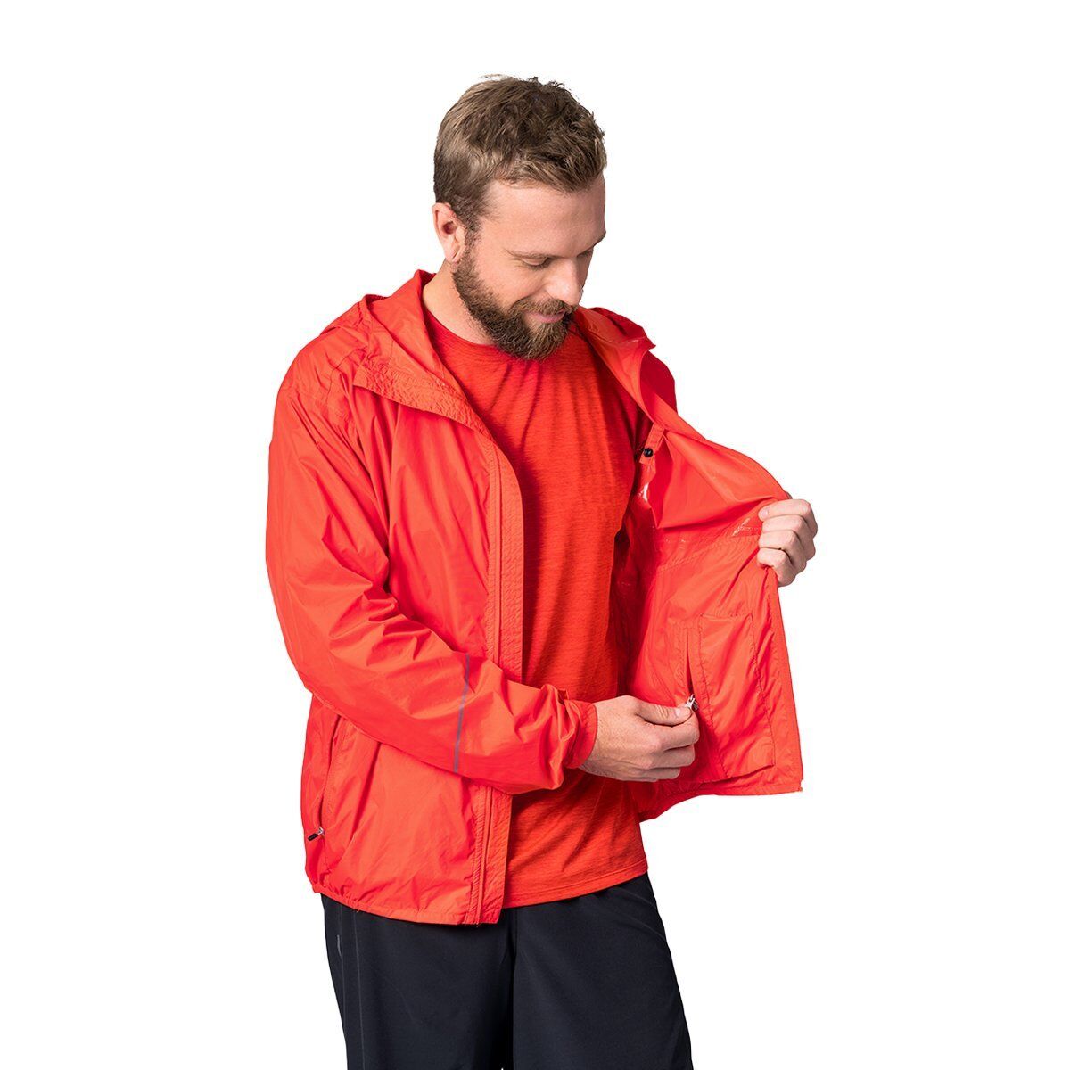 Su ve rüzgar geçirmez malzemeden üretilmiş olup kolaylıkla kendi cebine sığabilir.