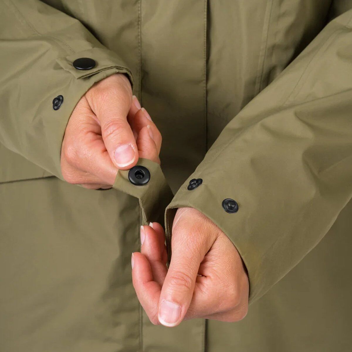 Ayarlanabilir bir kapüşona ve ayarlanabilir manşetlere sahip önceden şekillendirilmiş kollara sahiptir.