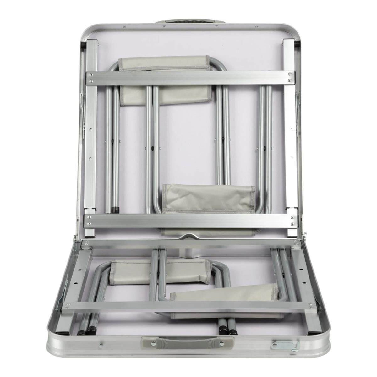 Set içerisinde yer alan dört katlanır tabure, saniyeler içinde açılarak ekstra oturma alanı oluşturur. Masanın teleskopik ayarlanabilir bacak sistemi, zeminin durumuna göre yüksekliğin 55–70 cm arasında değiştirilebilmesini sağlayarak kullanıcısına özel konfor sunar. Bu çok yönlü masa seti, doğada geçirilen her anı daha keyifli ve düzenli hale getirir.