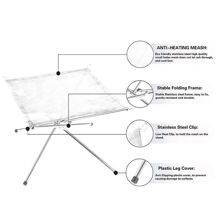 【Çevre dostu ve tekrar kullanılabilir】Dış mekan şömine ağı ısıya dayanıklı, çevre dostu ve ısıya dayanıklı paslanmaz çelik malzemeden yapılmıştır. Ağ çok yoğundur. Isıya dayanıklı ağ, toz veya döküntülerin düşmesini önler. Her kullanımdan sonra artıkları ve külleri atın! Bu nedenle, aileniz ve arkadaşlarınızla açık havada kamp ateşinin tadını çıkarmak için temizlik yapmak ve daha fazla zaman kazanmak kolaydır! Kauçuk kapaklı dört çelik boru daha güvenilir destek ve stabilite sağlar. Plastik bacak kapakları herhangi bir yüzeye zarar gelmesini önleyebilir ve şenlik ateşi rafının servis ömrünü uzatabilir.