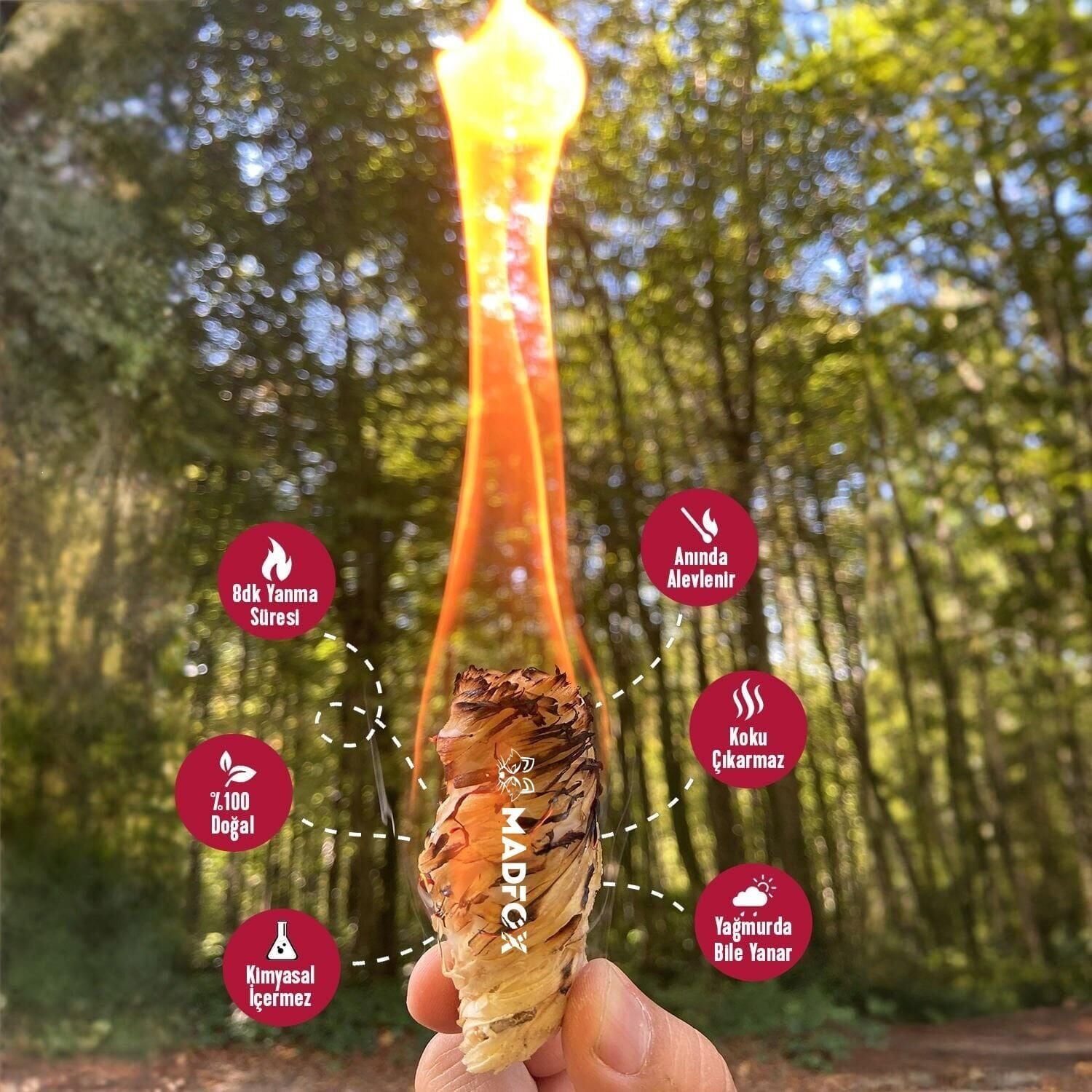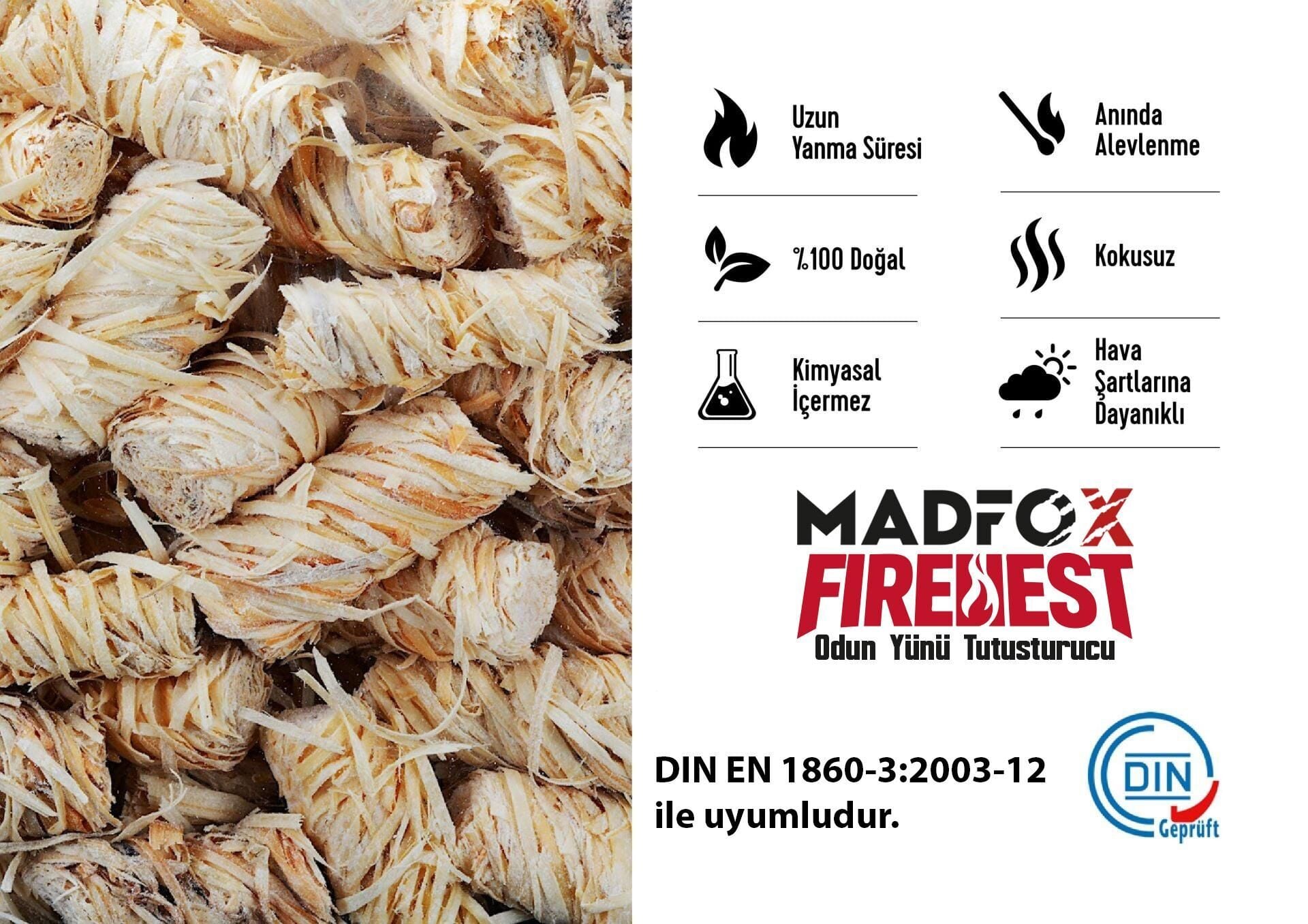 Madfox %100 doğal odun yününden üretilen, bitkisel vaks ile harmanlanan Madfox tutuşturucu; hızlı tutuşan yapısı, yüksek alev gücü ve uzun yanma süresiyle ateş yakma deneyimini kolay ve keyifli hale getirir. Kimyasal içermeyen, kokusuz ve is yapmayan yapısı sayesinde kapalı ve açık ortamlarda güvenle kullanılır. Mangal, şömine, soba, taş fırın ve kamp ateşi gibi tüm uygulamalarda odunların veya kömürlerin altına yerleştirip kolayca köz haline gelmesini sağlayabilirsiniz.