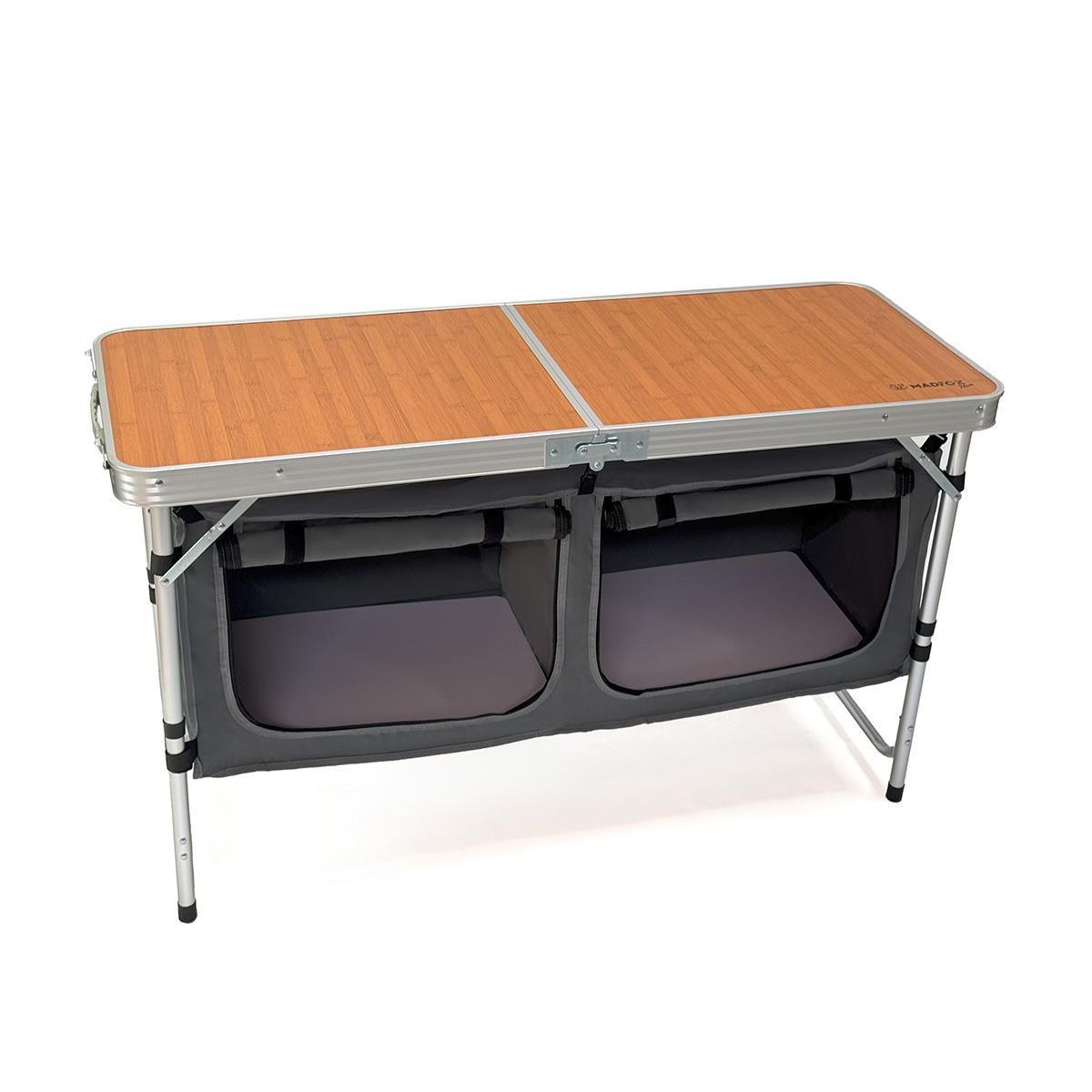Kurulumu ve toplaması kolay, son derece sağlam ve son derece hafif, katlanır tablalı ve yüksekliği ayrı ayrı ayarlanabilen ayaklara sahip hafif alüminyum katlanır kamp masası.