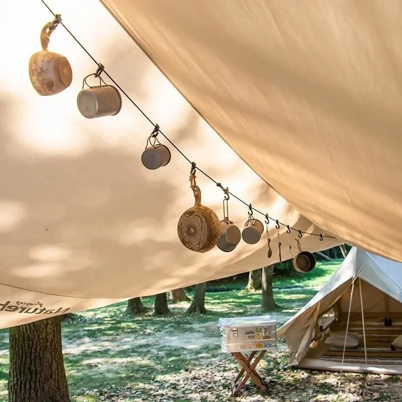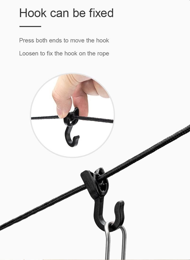Ayarlanabilir uzunlukta ve sabit kancalı çok işlevli askı ipi. Karabinalar yardımıyla ipi ağaçların arasına kolaylıkla sabitleyebilir, kancalara ekipmanlarınızı asmanız uygun olur, çamaşır ve bulaşıkları kurutabilirsiniz.