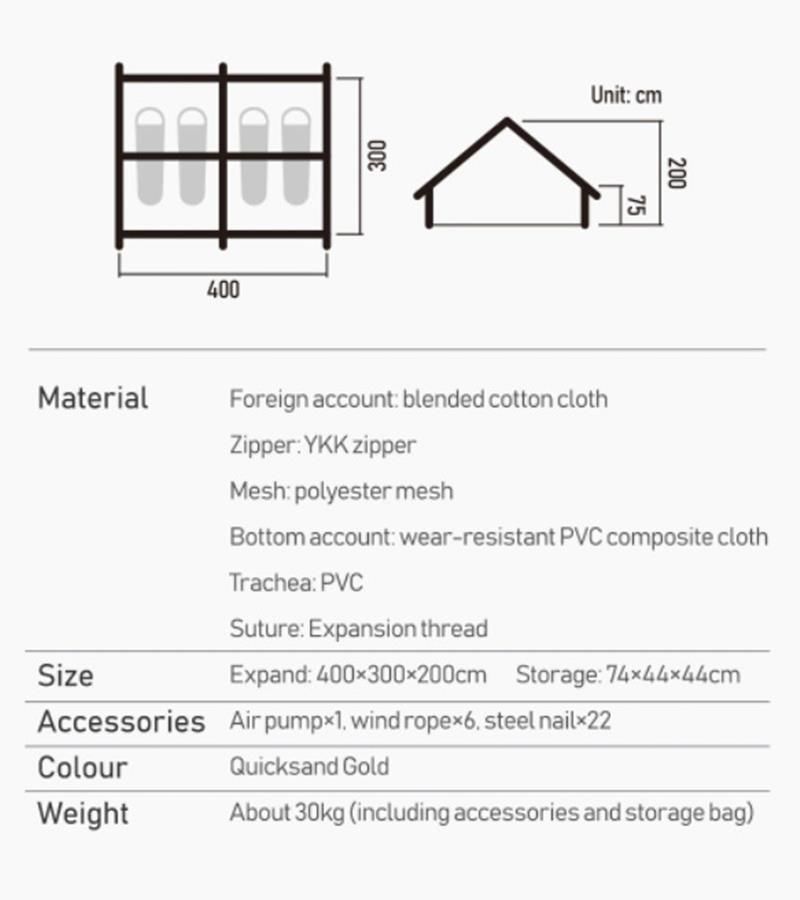 - Genişletilmiş boyut: 400 x 300 x 200 cm, kullanım alanı 12 metrekare