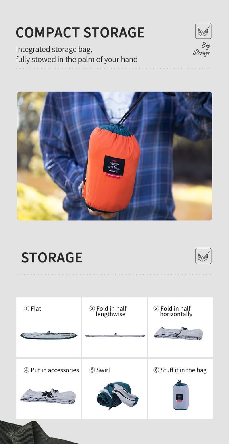 Naturehike hamak, aktif dinlenme, yürüyüş, piknik ve seyahat severler için özel olarak tasarlanmıştır. Hamakın katlanması çok kolaydır ve bir çantada veya sırt çantasında minimum yer kaplar. Yüksek kaliteli, dayanıklı malzemeden yapılmıştır