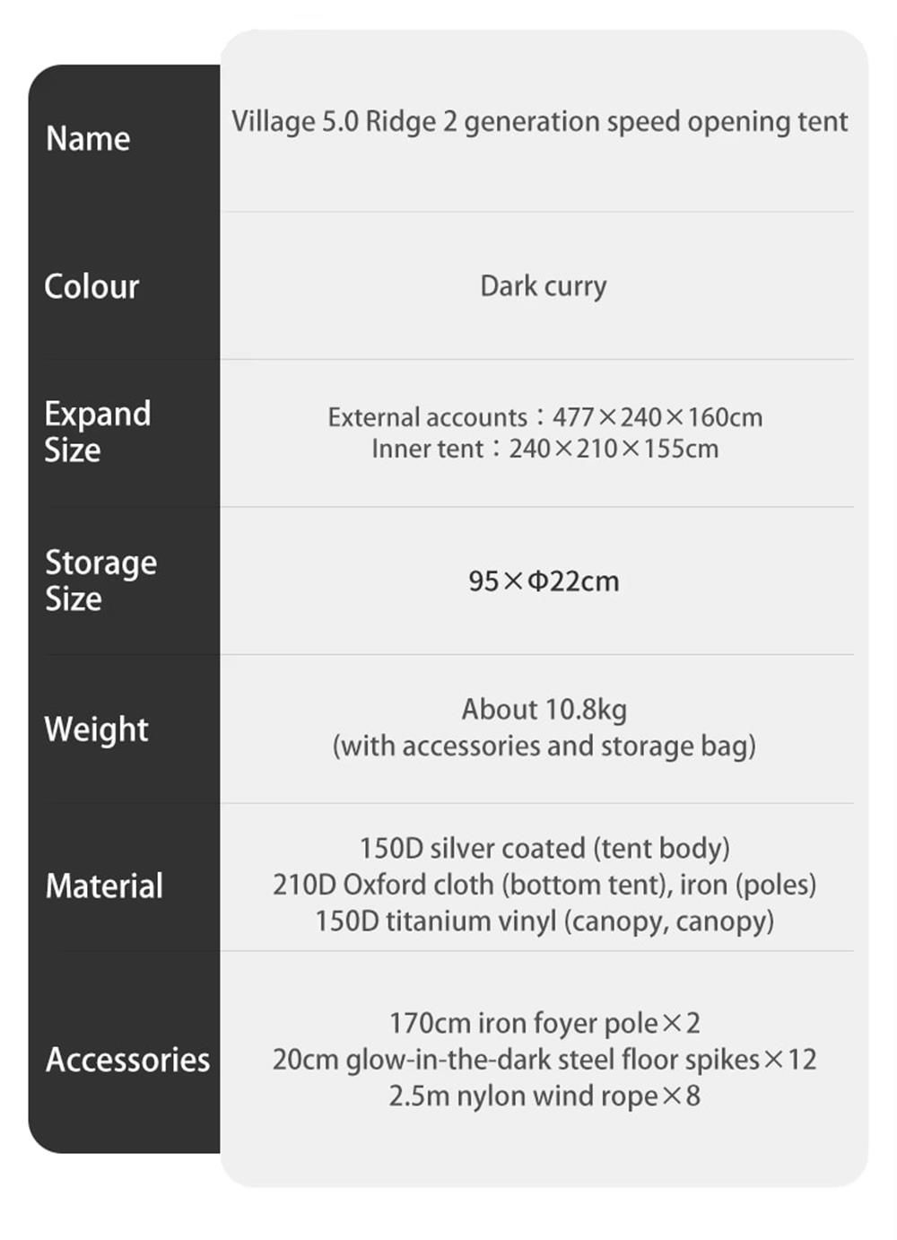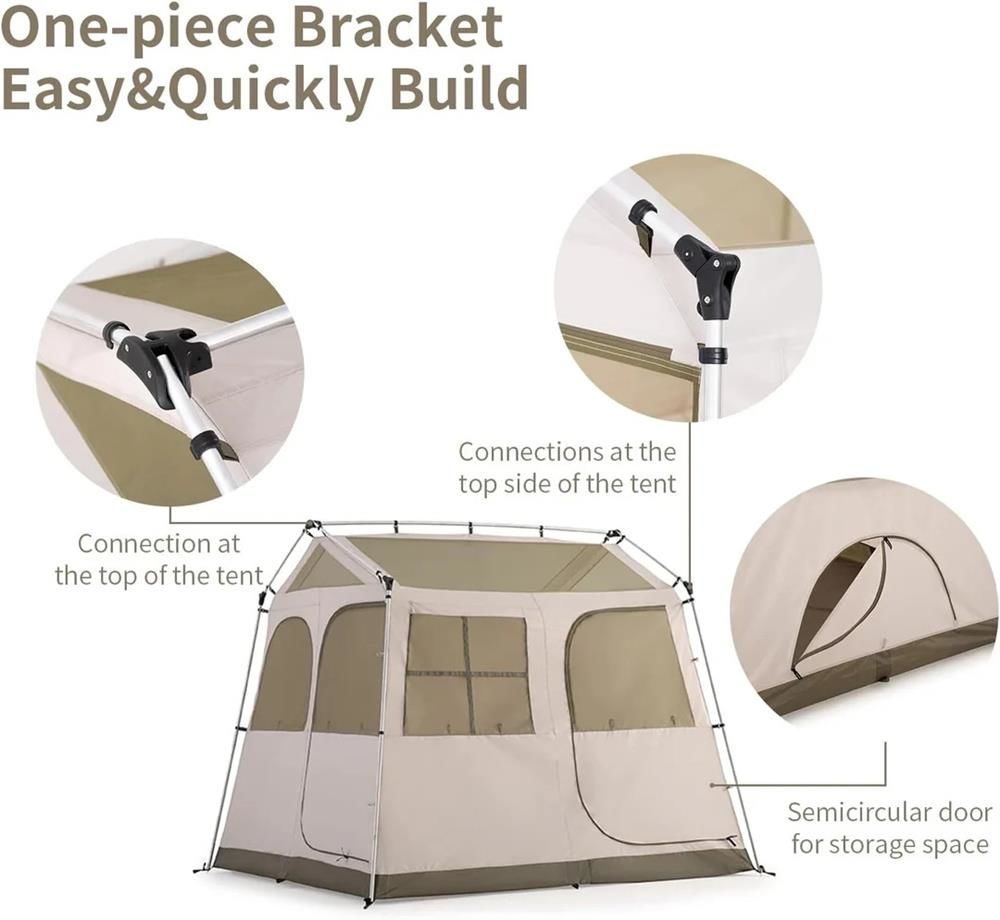 1. Çift Katmanlı Yapı : Village 5.0, düşünceli bir çift katmanlı yapıya sahiptir. İç çadır rahat bir tek yatak odalı alan sunarken, dış çadır iki ek küçük fuaye oluşturmak için genişler. Bu çok yönlü fuayeler evcil hayvan yaşam alanları veya ekstra depolama alanları olarak hizmet verebilir ve kamp deneyiminizi geliştirebilir.2. Tek Parça Alüminyum Direk Tutucu : Rahatlık ve denge için tasarlanan bu anında kurulabilen çadır, tek parça alüminyum direk tutucu sistemini kullanır. Tüm alüminyum çadır direkleri birbirine bağlıdır, bu da çadırı yalnızca daha dengeli hale getirmekle kalmaz, aynı zamanda daha hızlı ve kolay kurulum sağlar, sorunsuz kamp maceraları için idealdir.