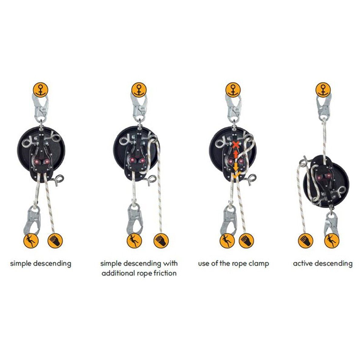Zor koşullarda ve tam yük altında bile kolay ve tasarruflu kullanım için dayanıklı plastikten yapılmış bir el çarkı ile donatılmıştır üç paslanmaz çelik halkalı cıvata, sorunsuz iniş hızı kontrolü ve çoklu çalışma modları sağlar arka taraf halat kelepçesi kaldırma işlemini kolaylaştırır kaldırmayı kolaylaştırmak için cihaz, matkap bağlantısı için altıgen bir adaptör ile donatılmıştır bağlantı noktası, çok yönlü ve kolay asma için 21 mm kapı açıklığına sahip çelik çift tetikli otomatik kilitleme konektörü ile donatılmıştır