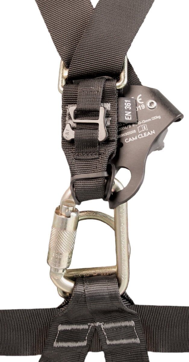 Omuz askılarının ana noktaya bağlanması için kullanılan çelik üçlü kilit karabina, göğüs yükseltici bağlantısı için alanı artırmak için Ağın dayanıklılığını artıran karabina üzerinde plastik kapaklı göğüs yükseltici akıllı sabitleme sistemi ( CAM CLEAN ile en iyi şekilde çalışır ) omuz askıları ve bacak halkaları bağımsız olarak ayarlanabilir boyun bölgesindeki omuz askılarında daraltılmış dolgu ve dokuma, rahat çalışmayı artırır EN 361'e göre düşme önleme için ek "A" işaretiyle işaretlenmiş ön ve arka bağlantı noktaları Düz arka bağlantı noktası, sırt çantası veya solunum cihazı taşırken kullanıcıların sırtına binmez.
