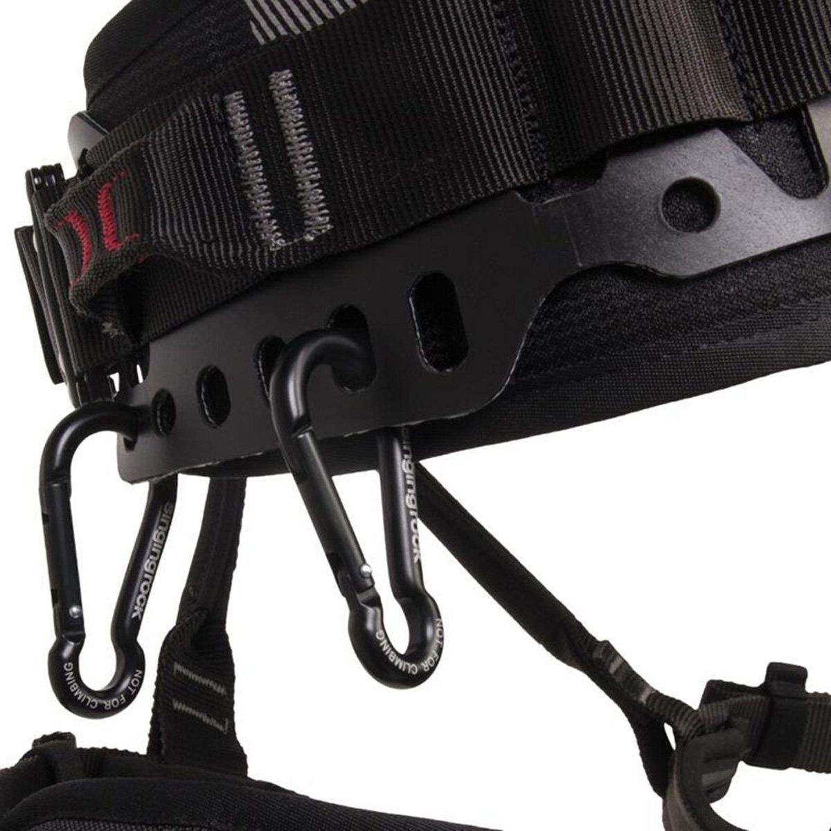 Arka hafif alaşım halka, 100 kg yük kapasiteli daha ağır aletler için gri tekstil halka ile donatılmıştır halka şeklindeki bacak halkaları hafiftir, ancak çok rahattır, boyutları çelik tokalarla kolayca ayarlanabilir ve arkadaki elastik bir kayışla çalışma konumlandırma kemerine bağlanırlar. sağ bacak halkasında küçük nesneler için neopren cep bel kemerindeki yansıtıcı baskı, emniyet kemerinin görünürlüğünü artırır