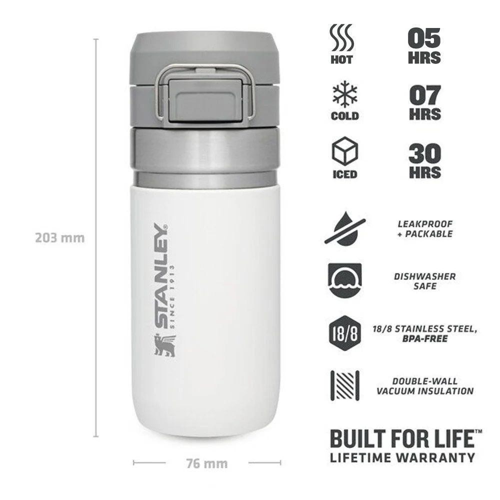 Stanley Quick termosun çift duvar vakumlu yalıtımı içeceklerinizi 5 saat sıcak, 7 saate kadar soğuk, 30 saate kadar buzlu tutar. Sadece düğmesine basın ve açın. Stanley Quick Flip Termos, bir çok bardak tutucu ile uyumludur ve açık hava maceraları için mükemmel bir yol arkadaşıdır. (Farklı renk ve boyut seçenekleri bulunmaktadır.)