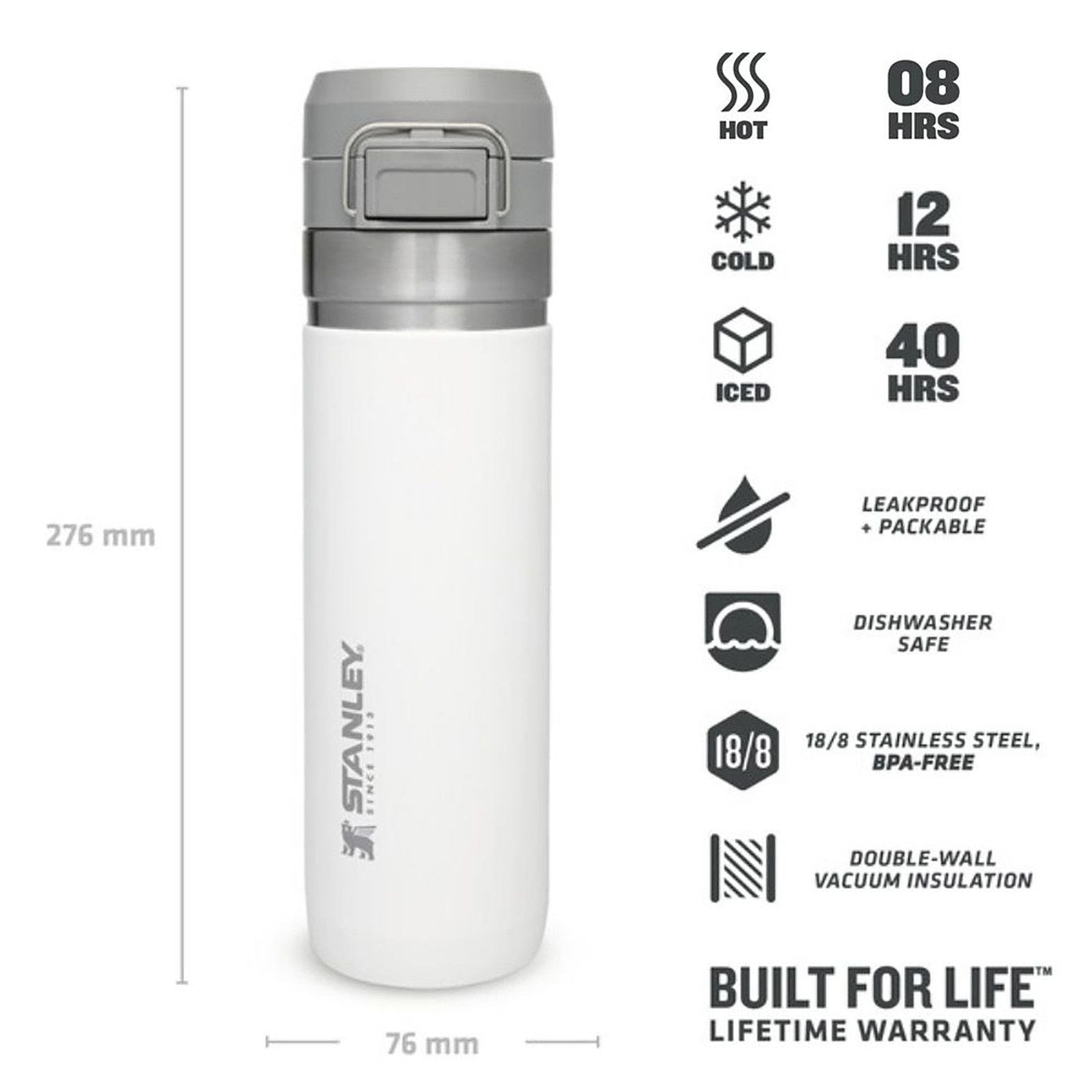 Stanley Quick Flip çift duvar vakumlu yalıtımı içeceklerinizi 8 saat sıcak, 12 saate kadar soğuk, 40 saate kadar buzlu tutar. Stanley Quick Flip termosumuzun sadece düğmesine basın ve açın. Stanley The Quick Flip, bir çok bardak tutucu ile uyumludur ve açık hava maceraları için mükemmel bir yol arkadaşıdır. (Farklı renk ve boyut seçenekleri bulunmaktadır.)